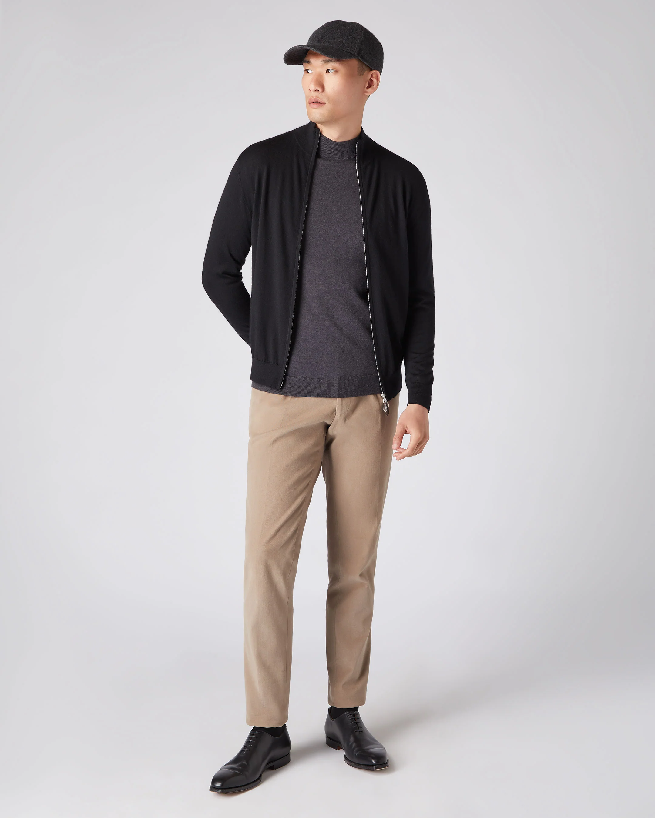 A masterclass in refined ease, this fine-gauge full-zip is the definition of versatile sophistication. Knitted from a luxurious blend of 70% cashmere and 30% silk, it delivers a smooth, supersoft feel that transitions effortlessly between relaxed and refined moments.